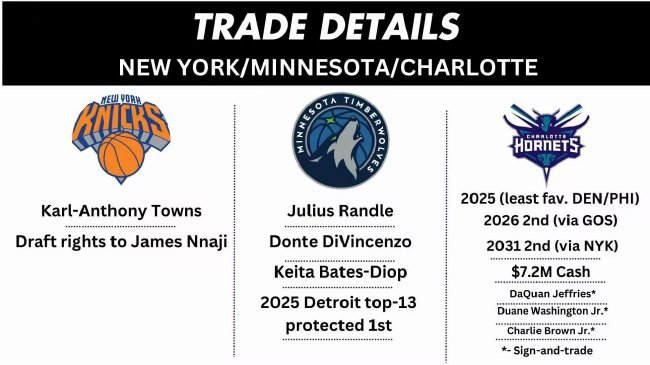 丛林狼获取兰德尔、迪文琴佐、迪奥普和2025年前13顺位保护的首轮签,这四个筹码王人来自尼克斯。其中这个首轮签是活塞的,若是2025年无法完了,将在2026年变为前11顺位保护的首轮签,若是2026年仍无法完了,则在2027年变为前9顺位的首轮签,若是仍然无法完了,则变为次轮签。