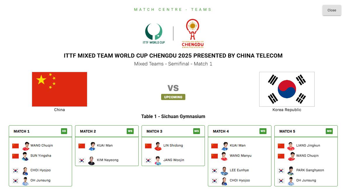 第一盘:王楚钦/孙颖莎vs吴晙诚/崔孝珠第二盘:蒯曼vs金娜英第三盘:林诗栋vs张禹珍第四盘:蒯曼/王曼昱vs李恩惠/崔孝珠第五盘:王楚钦/梁靖崑vs朴康贤/吴晙诚