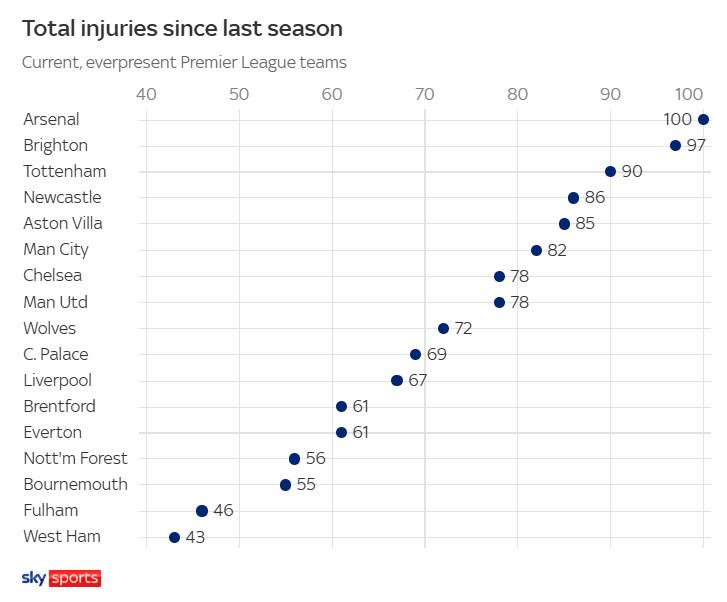 本-怀特在对阵狼队的上半场比赛中因伤退场,这也让阿森纳成为以前两个赛季英超首支伤病次数崎岖百次的球队,无奈登顶伤病榜首位。布莱顿以97次伤病位居第二,阿森纳的北伦敦死敌热刺则以90次伤病名轮番三。