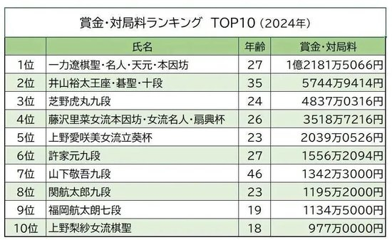 以上这份日本国内比赛冠军奖金榜单的背后,是日本围棋专有的温室生态。日本棋圣战冠军奖金高达4300万日元,比LG杯冠军还越过一截,号称公共最“豪”国内赛事;名东谈主战、王座战等比赛奖金均超千万日元,琳琅满主意赛事让日本棋手无需出征海外赛场,就能达成收入登顶。