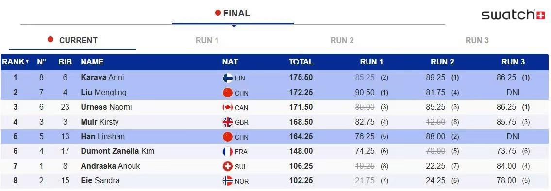 2025-2026赛季国外雪联单板及解放式滑雪大跳台寰宇杯北京站参加决赛日,在女子解放式滑雪决赛中,中国队刘梦婷凭借前两轮出色的推崇,以172.25分夺得银牌,芬兰选手安妮·凯雷韦以175.50分夺冠,中国选手韩林杉最终位列第五。