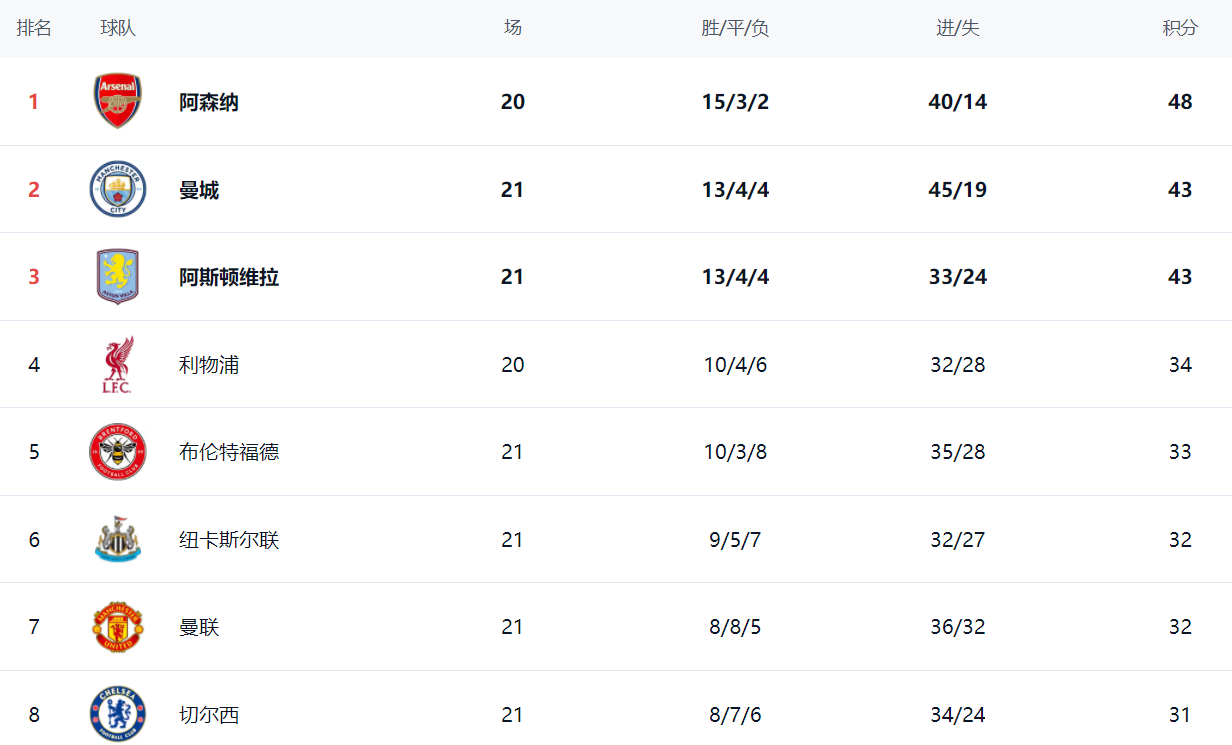 在积分榜上,曼联和阿斯顿维拉纷繁丢分,让阿森纳赚大了。阿森纳总积分是48分。曼城和阿斯顿维拉齐是43分。阿森纳超越5分,况且仍是少赛一场。如若阿森纳接下来大概打败利物浦,将把上风扩大到8分。利物浦当今34分,排行第4。布伦特福德以33分排行第5。纽卡斯尔联和曼联齐是32分。