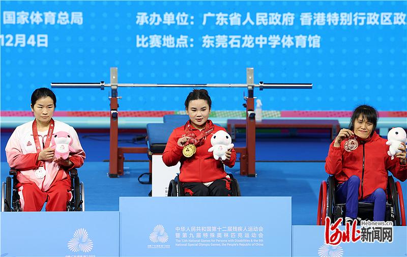 11月30日,在宇宙第十二届残运会举重比赛中,河北灵通员郭玲玲(中)取得女子45公斤级最好分量冠军和总分量冠军。 河北日报记者 史晟全摄