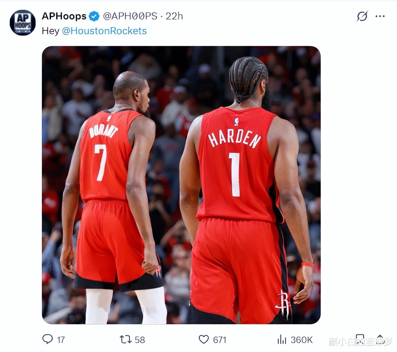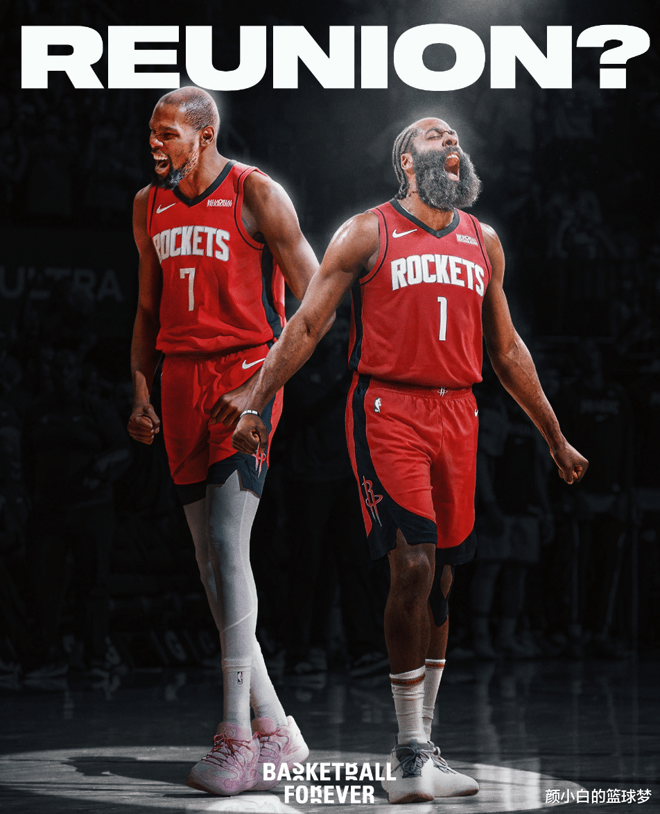 船媒赛后PS了一张杜兰特、哈登身穿火箭球衣的图,他还写谈Hey 休斯顿火箭。一天之前他也为骑士队举荐了哈登,他果真是为哈登操碎了心。