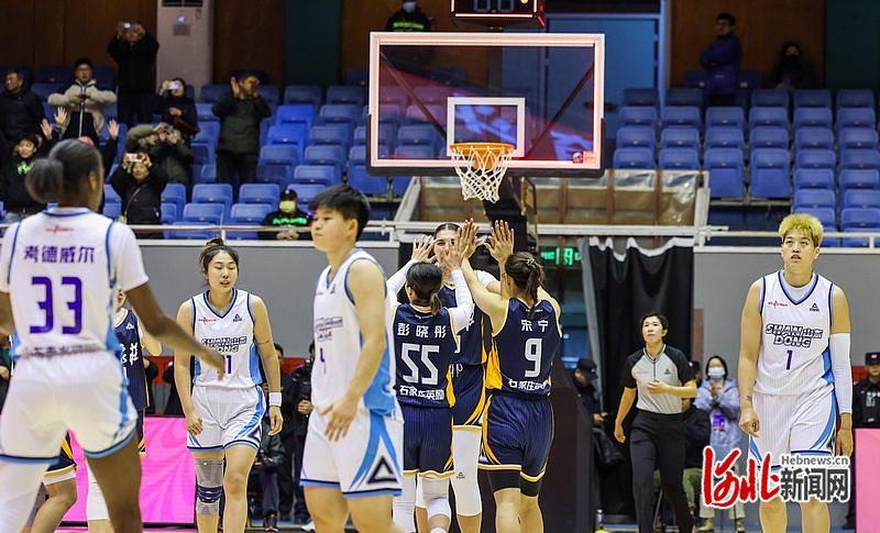 12月2日,石家庄英励女篮队员庆祝得胜。